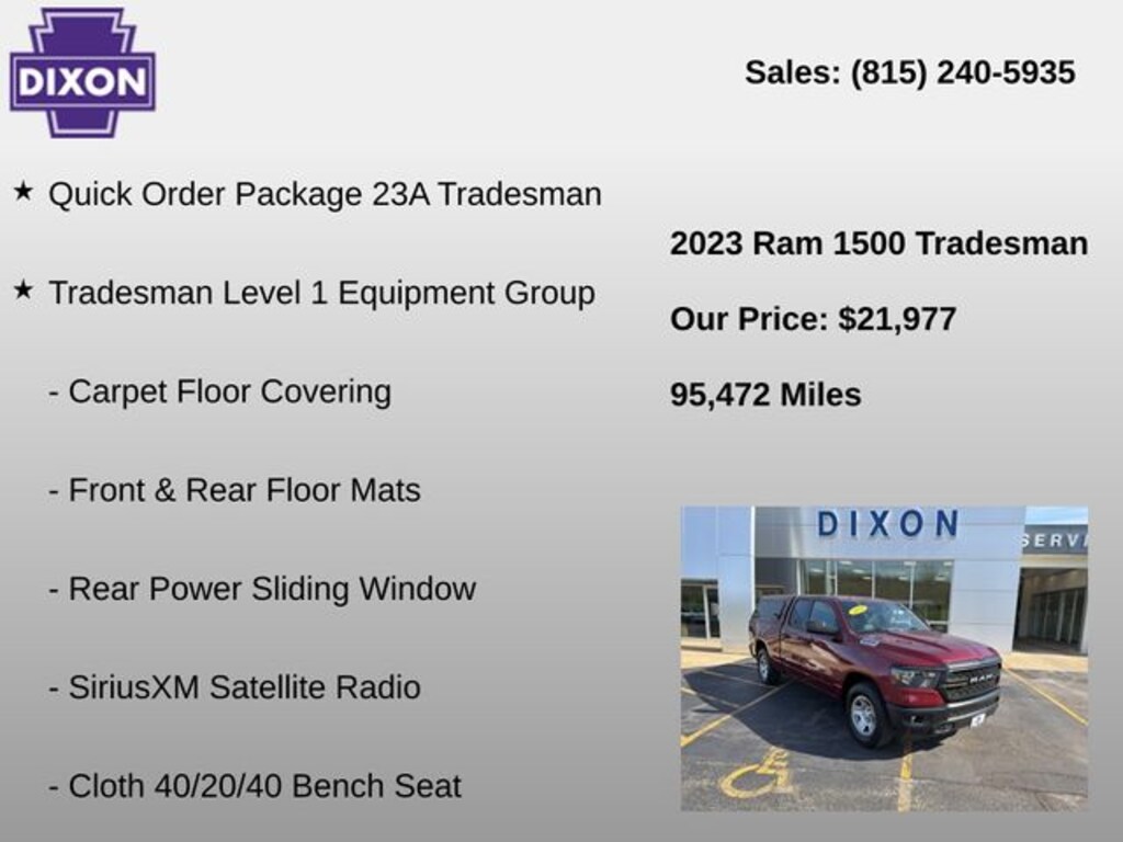 ** Alloy Wheels / Premium Wheels, ** Apple CarPlay/Android Auto, ** Automatic Emergency Braking, ** Backup Camera, ** Blind Spot Monitor, ** Bluetooth, Hands Free, ** Brake Assist, ** Cross Traffic Alert, ** Cruise Control, ** Keyless Entry, ** Keyless Start, ** Lane Departure Warning, ** Portable Audio Connection, ** Premium Sound System / Premium Audio, ** Satellite Radio, ** Stability Control, ** Steering Wheel Controls, ** USB Port, 3 Rear Seat Head Restraints, 4 Way Front Headrests, 40/20/40 Split Bench Seat, Advanced Brake Assist, Auto-Dimming Rear-View Mirror, Bed Utility Group, Carpet Floor Covering, Cloth 40/20/40 Bench Seat, Front & Rear Floor Mats, Front Center Seat Cushion Storage, Full Speed Forward Collision Warning Plus, Lane Keep Assist, Level 1 Safety Group, Manual Adjust 4-Way Driver Seat, Manual Adjust 4-Way Front Passenger Seat, MOPAR 4 Adjustable Cargo Tie-Down Hooks, MOPAR Deployable Bed Step, MOPAR Spray In Bedliner, Pedestrian Emergency Braking, Pick-Up Box Lighting, Quick Order Package 23A Tradesman, Rear Folding Seat, Rear Power Sliding Window, SiriusXM Satellite Radio, Tradesman Level 1 Equipment Group.
